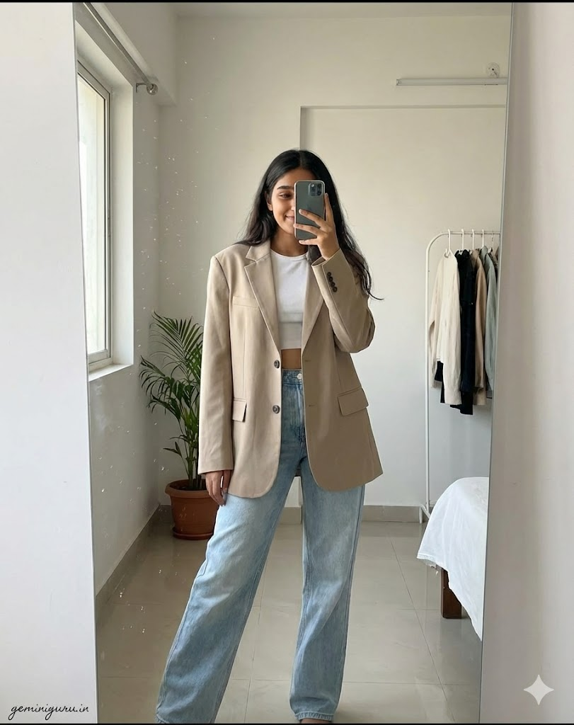 PROMPT: Full-body mirror selfie in a minimalist bedroom with a large floor-length mirror. Subject is wearing a stylish oversized blazer, crop top, and wide-leg jeans. POSE: Standing with one leg forward (fashion stance). Holding the smartphone up to the mirror, covering half the face. LIGHTING: Soft natural daylight from a nearby window. Clean, bright aesthetic. Mirror glass has slight dust texture for realism.