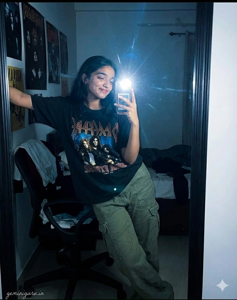 PROMPT: Trendy mirror selfie with direct camera flash (Hard Lighting). Subject is wearing a vintage graphic tee and baggy cargo pants. Background is a slightly messy bedroom with clothes/posters (lived-in vibe). POSE: Leaning coolly against the wall or mirror frame. Phone is tilted. Flash flare visible on the mirror surface. LIGHTING: Dark room lit only by the bright phone flash. High contrast. “Cool” color temperature (blues/cyans).