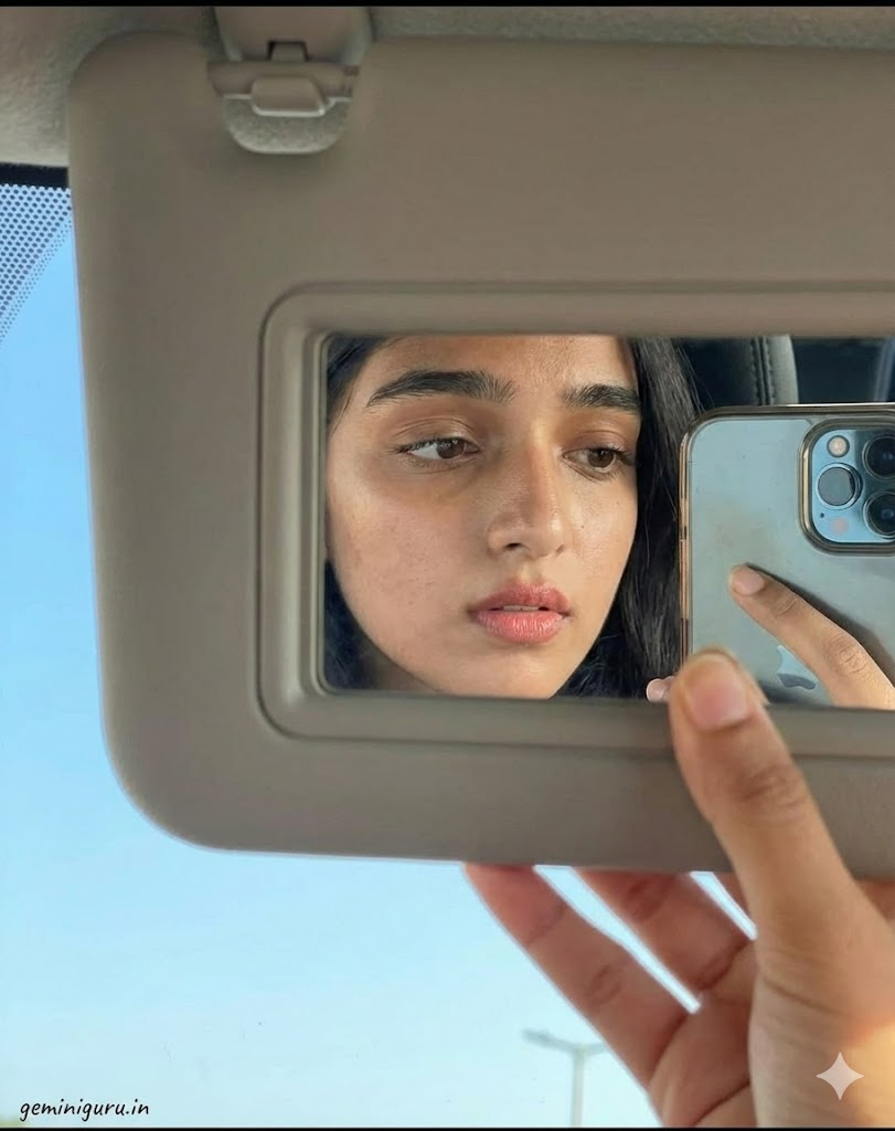 PROMPT: Close-up beauty shot in a car’s sun visor vanity mirror. Focus is tight on the eyes and makeup details. POSE: Pulling the visor down, looking intensely into the small mirror. Phone is visible in the reflection. LIGHTING: Natural daylight coming through the car windshield (flattering, even light). Blue sky visible in the background. Sharp, high-resolution texture.
