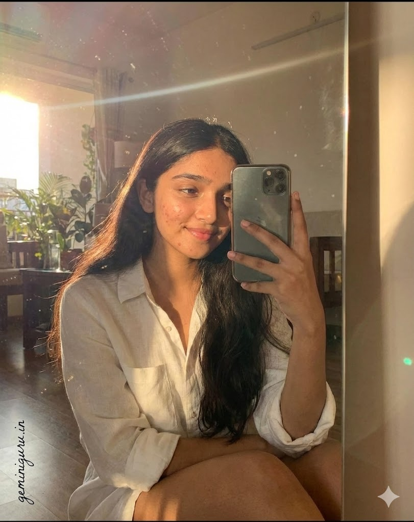 PROMPT: Aesthetic mirror selfie during golden hour. Subject is wearing a cute summer sundress or white linen shirt. POSE: Sitting on the floor in front of a mirror, or standing close up. Smiling gently. LIGHTING: Intense warm sunlight hitting the subject directly from the side. “Lens flare” effect in the mirror reflection. Dust motes dancing in the light.