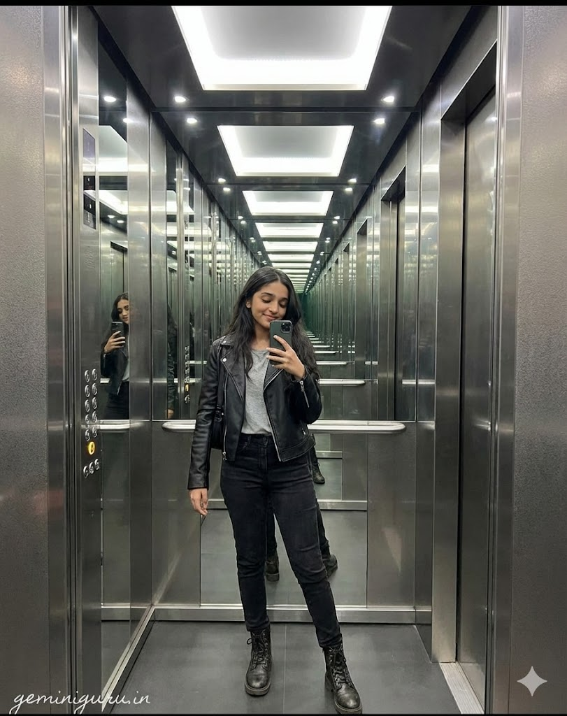 PROMPT: Urban lifestyle selfie taken in a luxury elevator with mirrored walls. Subject is wearing a street-style outfit (Leather jacket, boots). POSE: Wide-angle shot (0.5x zoom style). Looking at the phone screen, not the mirror. “Infinite reflection” effect in the background. LIGHTING: Bright overhead elevator buttons/lights. Metallic reflections on the walls. Neutral, modern color palette (Greys/Silvers).