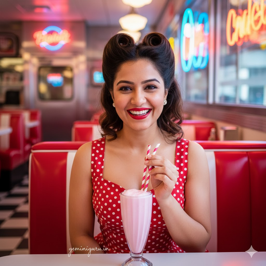 PROMPT: Vintage 1950s Americana lifestyle shot in a retro diner. Subject is wearing a red and white polka dot swing dress with a sweetheart neckline. “Victory Rolls” hairstyle. POSE: Sitting at a booth, sharing a strawberry milkshake with two straws (or holding it). Playful, wide smile. LIGHTING: Bright, saturated “Technicolor” film look. Neon signs in the background. High contrast. glossy red lips.