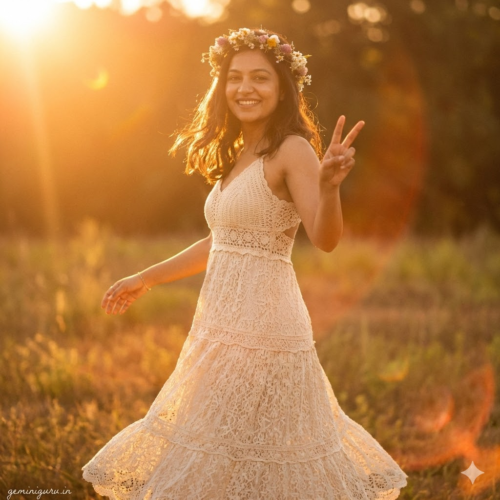 PROMPT: Dreamy 1970s outdoor portrait. Subject is wearing a flowy crochet lace maxi dress or bell-bottom jumpsuit with floral patterns. Flower crown in hair. POSE: Twirling in a field or sitting on a vintage van. Peace sign or arms open wide. LIGHTING: Heavy “Golden Hour” lens flare (hazy sun). Warm, yellow/orange color grading (Kodachrome film simulation).