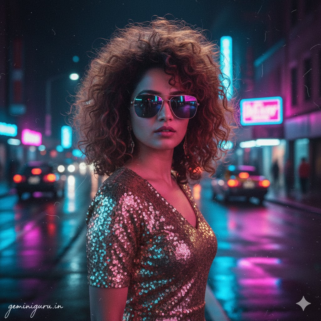 PROMPT: Cinematic 1980s night portrait. Subject is wearing an oversized blazer with shoulder pads (Power Suit) or a metallic sequin dress. Big, voluminous curly hair. POSE: Standing in a retro arcade or neon-lit city street. Looking over sunglasses. Confident attitude. LIGHTING: Blue and pink neon ambient light (Cyberpunk aesthetic). Hard shadows. “VHS” tape grain/glitch effect (optional).