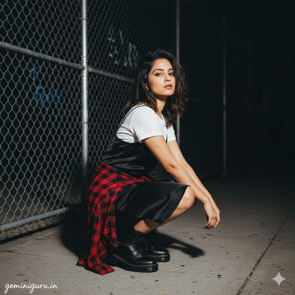 PROMPT: Raw 1990s fashion editorial. Subject is wearing a silk slip dress over a white t-shirt, paired with chunky combat boots. Flannel shirt tied around waist. POSE: Crouching on a sidewalk or leaning against a chain-link fence. “Messy” hair. Nonchalant expression. LIGHTING: Direct camera flash (hard lighting) against a dark background. High contrast. Realistic, gritty texture.