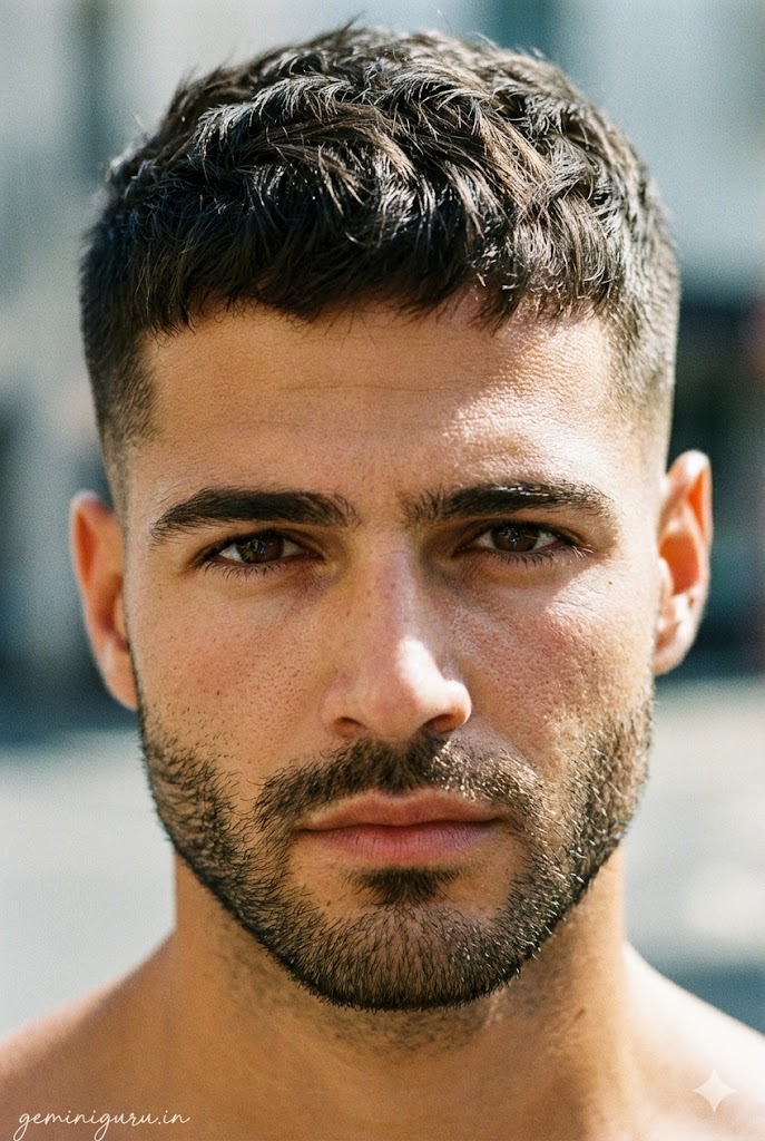 Use uploaded reference image only. Face must be 100% identical and instantly recognizable. No AI smoothing, reshaping, or alteration. Maintain real pores, natural highlights, and authentic human skin texture. Must look like real photography, not digital art. Close-up portrait of the subject with a textured French Crop fade. Shot on 35mm film, Kodak Portra 400 stock. Visible film grain and high ISO noise. Lighting is harsh top-down street light creating deep shadows in the hair texture. Skin is not smooth; visible pores and micro imperfections. Dirty realism, 8k.