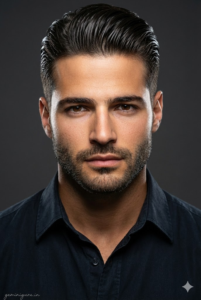 Use uploaded reference image only. Face must be 100% identical and instantly recognizable. No AI smoothing, reshaping, or alteration. Maintain real pores, natural highlights, and authentic human skin texture. Must look like real photography, not digital art. Studio portrait of the subject with a classic slick-back undercut. Three-point lighting setup: Key light 45-degrees, sharp Rim light behind to separate hair from background. High specular highlights on the hair styling product (pomade). Sharp focus, f/8 aperture for deep depth of field. Professional retouching style.