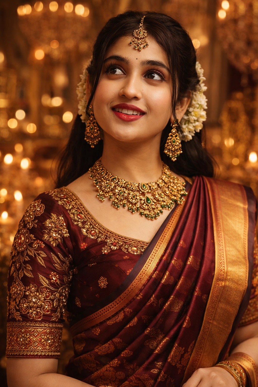 Keep face consistent & Create a realistic portrait of an Indian woman wearing a rich silk saree with traditional gold jewelry, soft warm lighting, natural skin texture, elegant posture, and a royal festive atmosphere.