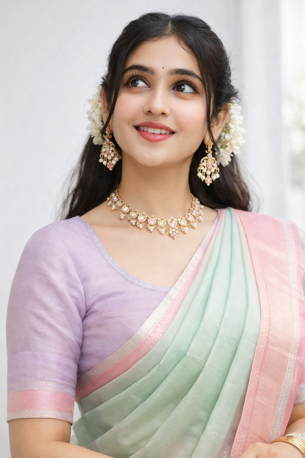 Keep face consistent & Generate a minimal aesthetic saree look with pastel shades, natural daylight, soft shadows, clean background, subtle makeup, and a calm modern Indian vibe.