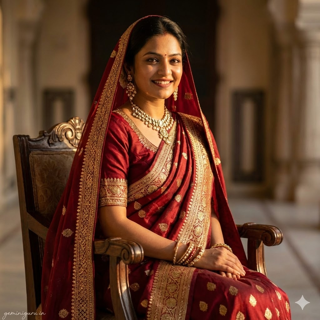PROMPT: High-end traditional bridal portrait. Subject is wearing a rich, deep red Banarasi silk saree with heavy gold zari embroidery and traditional bridal jewelry (Kundan/Polki). POSE: Seated regally on an antique chair, pallu draped over the head like a veil. Looking down shyly or at the camera with confidence. LIGHTING: Warm, golden hour light hitting the fabric from the side, creating specular highlights on the gold thread work. Background is a blurred heritage palace interior. Shot on 85mm lens.