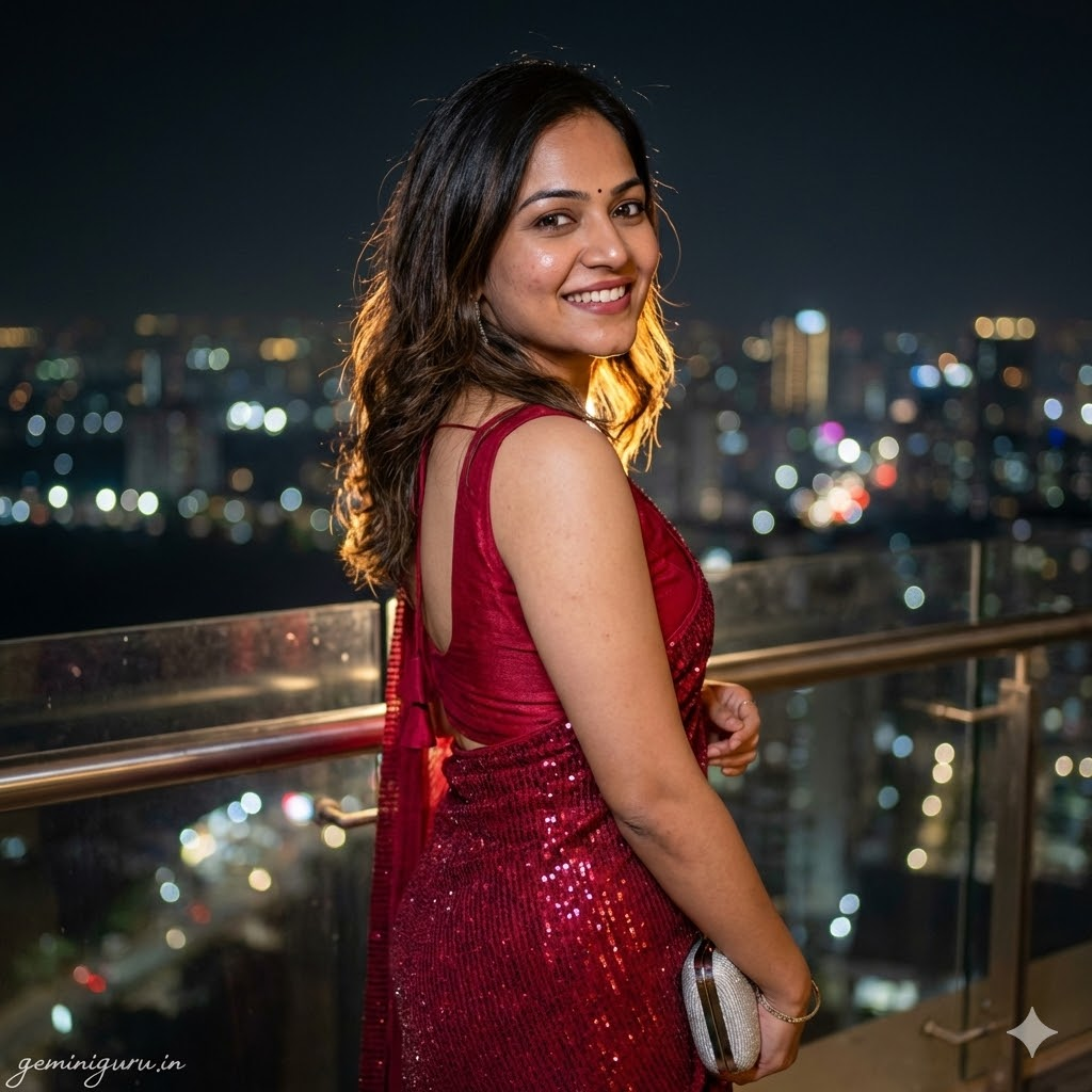 PROMPT: Glamorous night-time fashion shot. Subject is wearing a sparkling crimson red sequined saree (designer cocktail style) with a sleeveless blouse. POSE: Standing on a high-rise balcony overlooking a city skyline at night. Holding a clutch purse. Looking over shoulder with a “red carpet” smile. LIGHTING: Mixed lighting—cool ambient city lights in the background (bokeh) and a warm, hard “Rim Light” hitting the subject, making the sequins sparkle intensely. High contrast.