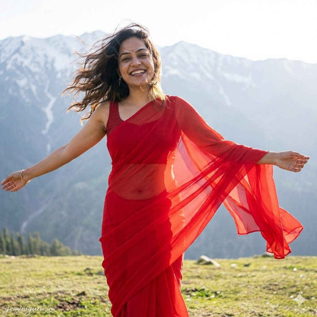 PROMPT: Cinematic romantic style shot in a vast landscape (like snow mountains or green rolling hills). Subject is wearing a plain, translucent red chiffon saree that is flying dramatically in the wind. POSE: Arms outstretched, enjoying the breeze. Hair blowing wildly. LIGHTING: Bright daylight. The sun is behind the subject (backlight), showing the translucency of the red fabric. Dreamy, soft aesthetic.