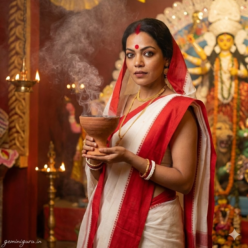 PROMPT: Traditional Bengali cultural portrait (Durga Puja vibe). Subject is wearing a white cotton or silk saree with a broad red border draped in the traditional Bengali style. Large red bindi, shakha pola bangles. POSE: Holding a “Dhunuchi” (clay incense burner) with smoke rising, or offering flowers. Expressive eyes. LIGHTING: Warm, festive ambient light (like inside a pandal or temple). Rich colors. Smoke adds atmosphere.