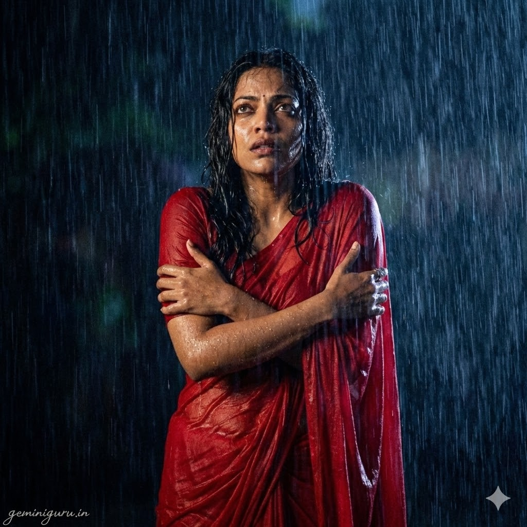 PROMPT: Retro 90s Bollywood movie still style. Subject is wearing a red saree in heavy rain. The fabric is wet and clinging naturally to the body. Hair is wet and messy. POSE: Dramatic pose looking up at the rain, or hugging self due to cold. Intense expression. LIGHTING: Dark, moody monsoon sky. High contrast lighting highlighting the wet texture of the skin and fabric. Film grain added for vintage feel.